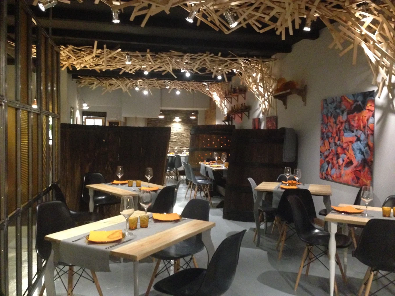 A encontrar ese equilibrio ayuda un comedor muy acogedor. La evocación de los sarmientos entrelazados sobrevuela sobre la cabeza de los comensales. Y en las paredes, la imagen de unas brasas intensas anticipa el qué y el cómo se puede disfrutar de la gastronomía.